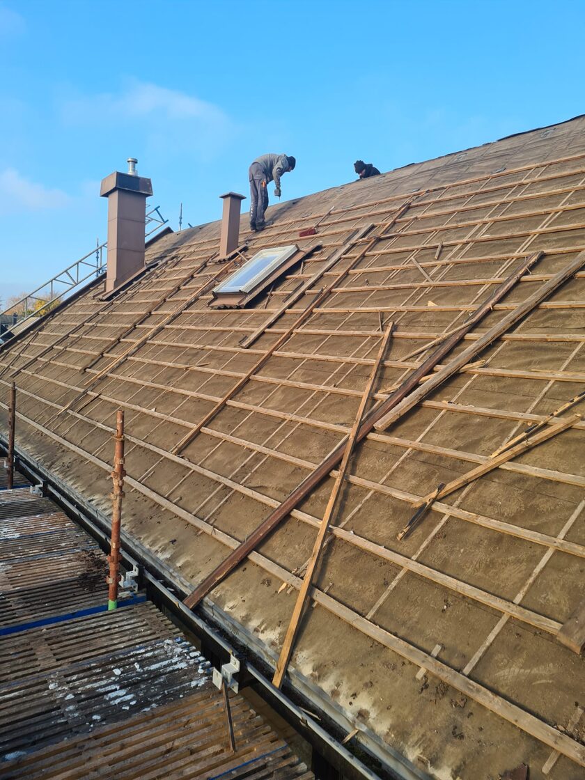 Sākumā tiek noņemts vecais dakstiņa segums, latojums, kā arī apakšklājs