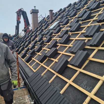 Jumta klāja un seguma nomaiņas process, kur klienti izvēlējušies dakstiņa jumta segumu